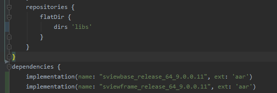 修改dependencies : implementation(name: 'sviewframe_realease_64_9.0.0.11', ext: 'aar'),其中name就是libs目录下sviewframe的64位aar文件名称,ext是其扩展名。