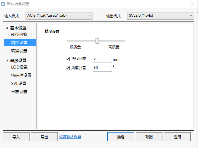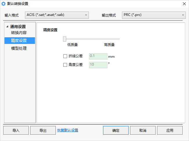 优先使用模型中的轻量化数据:Catia模型中存在轻量化Cgr数据,Jt模型中也会保存轻量化数据, 若勾选此选项,当转换成mesh数据格式时不会再对模型进行面片化处理