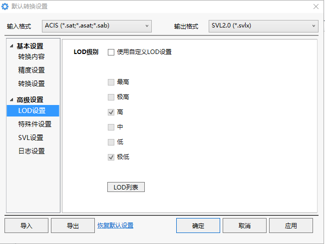 使用自定义的LOD设置:使用自定义的LOD设置,选择输出最高、极高、高、中、低、极低LOD级别;