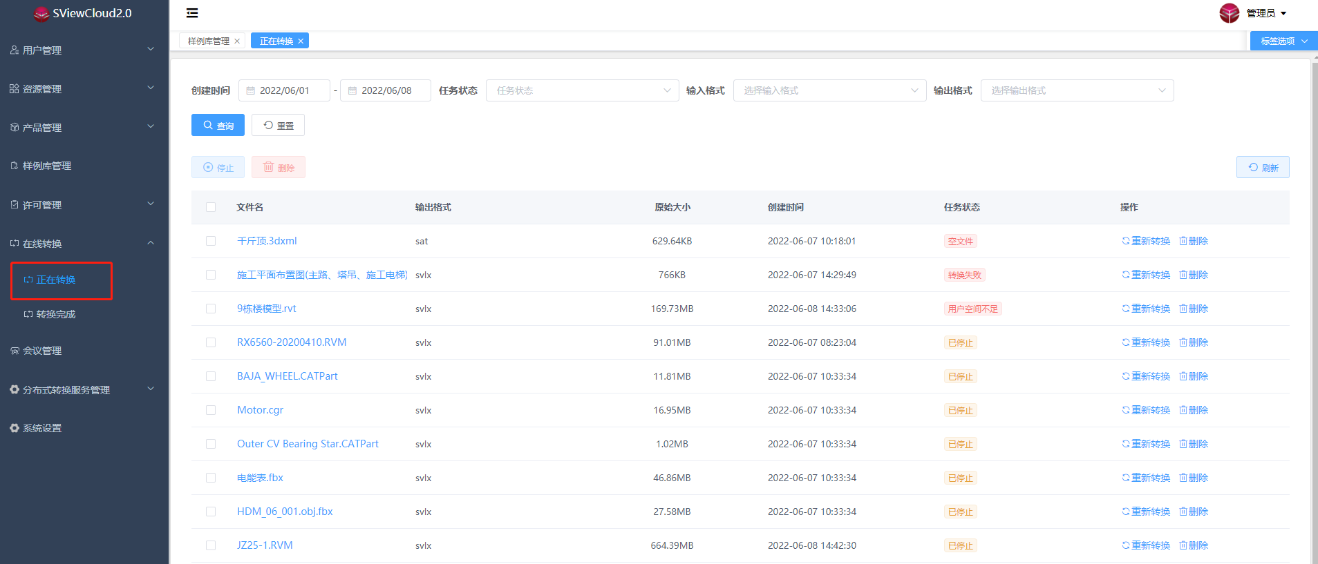 点击在线转换中的正在转换进入正在转换管理页面,此页面主要是查看和管理所有转换中、等待中、转换失败跟转换停止的任务。