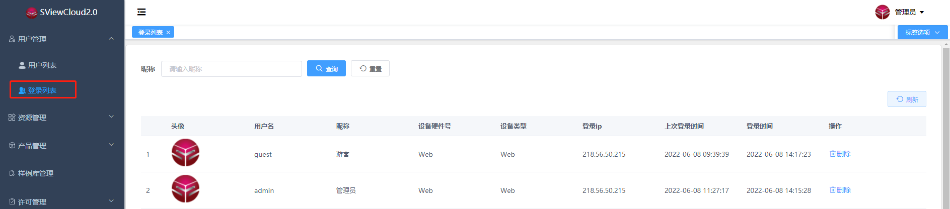 - 操作栏按钮可以删除许可产品