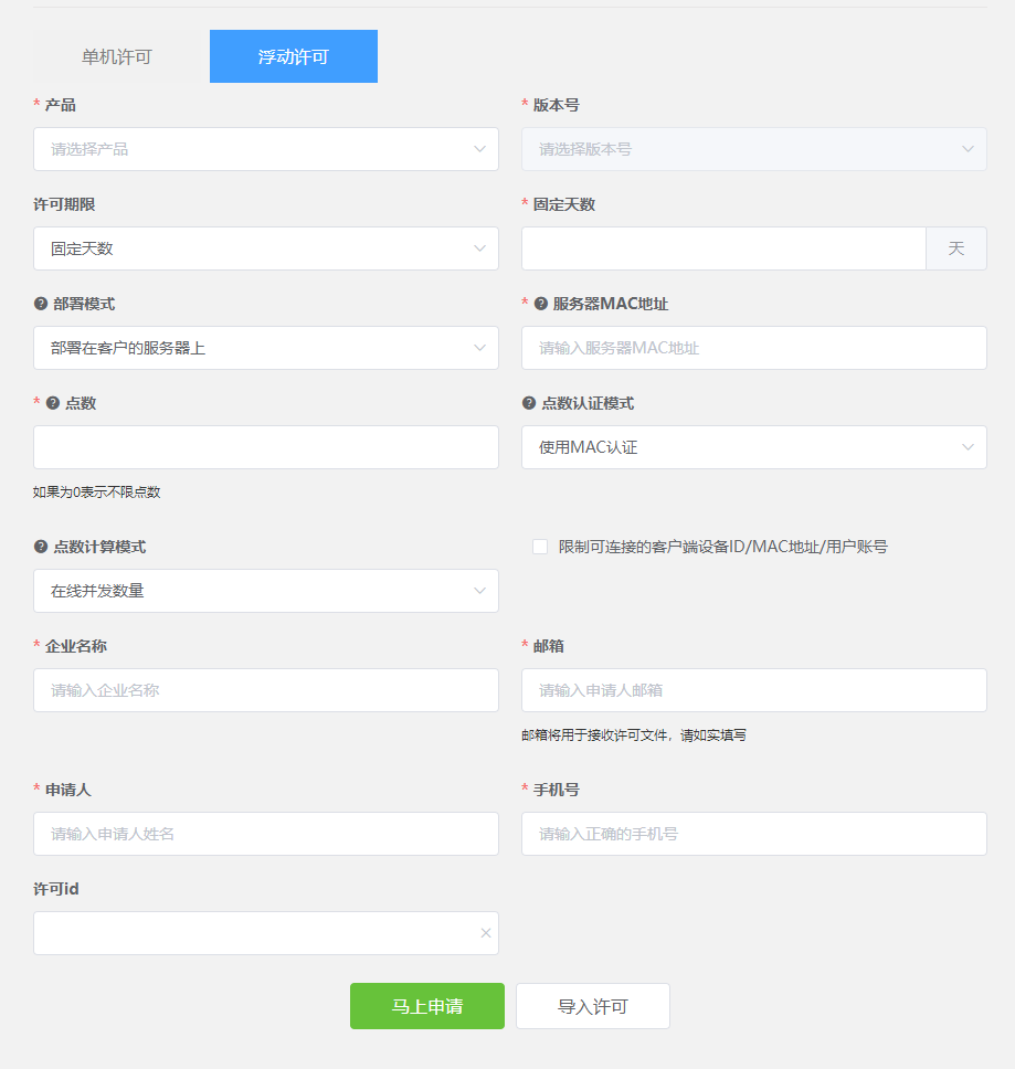 该项禁止手动输入,导入许可时,自动填充许可id,该项为空时,默认申请新的许可,否则将在原许可基础上申请,即更新原许可。