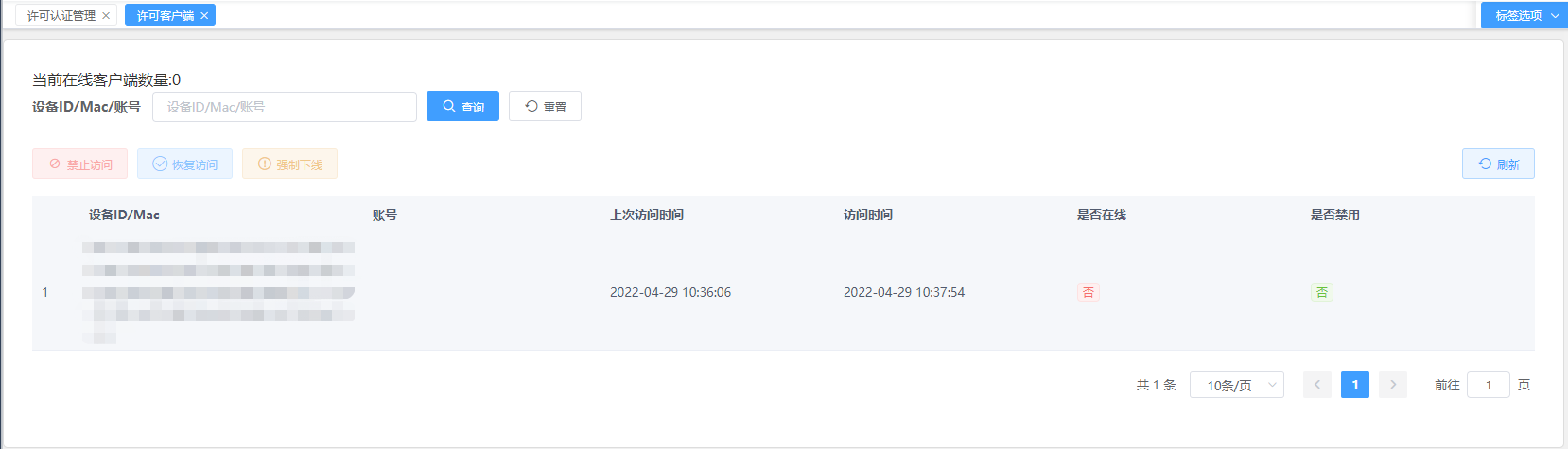 - 查看客户端:选中一条许可记录后,点击查看客户端,可以查看该条许可的客户端使用情况,如图