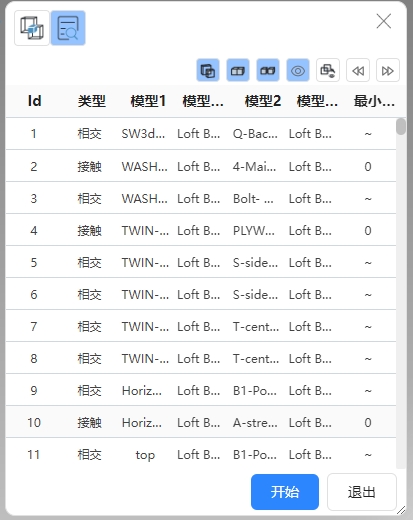 干涉检查结果:点击可查看当前干涉检查结果,结果列表显示如下图所示