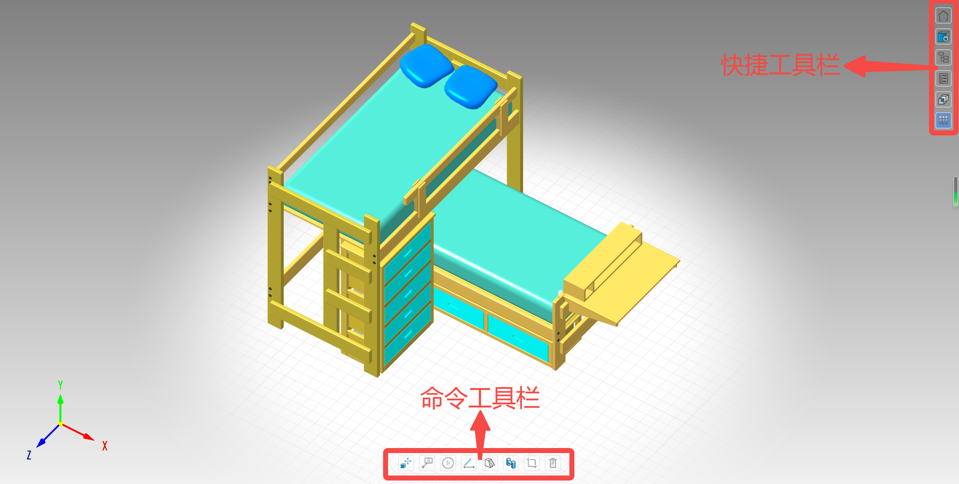 模型操作界面主要包括快捷工具栏、命令工具栏及模型操作区域,如下图所示: